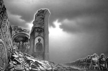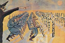 Рубрика "80 дней до Победы" Константин Васильев "Нашествие" 1970-е Константин Васильев — дитя войны, он родился в 1942 году в Майкопе во время немецкой оккупации, и это одна из причин, почему тема войны так часто проявлялась в его творчестве. В эту подборку мы выбрали его работу «Нашествие», уникальную по цветовой гамме, сюжету и композиции. В целом Васильев известен полотнами на былинно-мифологические темы, художника вдохновляли исландские саги и другие героические эпосы. Но другие работы мастера отличаются насыщенной палитрой оттенков и кристальной чистотой цветов. Здесь мы видим сумрачное, почти монохромное изображение. В центре — фрески разрушенного храма. Идея объединить изображения святых с темой войны была для начала 1970‑х годов новой и довольно смелой. 13.04.2025