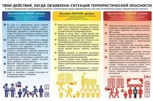 В настоящее время терроризм является одной из наиболее опасных угроз безопасности и стабильности в мире. Сегодня жертвами террористов в первую очередь оказываются мирные люди. Чаще всего они не знают, как вести себя при угрозе теракта или при совершенном террористическом нападении. Предлагаем Вашему вниманию алгоритм действий, который может помочь лучше ориентироваться в вопросах обеспечения личной безопасности в условиях угрозы террористических проявлений. Как вести себя при обнаружении подозрительного предмета, который может оказаться взрывным устройством: Если вы обнаружили забытую или бесхозную вещь в общественном транспорте,в подъезде своего дома, в учреждении опросите людей, находящихся рядом. Постарайтесь установить, чья она и кто ее мог оставить. Если хозяин не установлен, немедленно сообщите о находке в ваше отделение полиции, администрации или охране. Разъясните детям, что любой предмет, найденный на улице или в подъезде может представлять опасность. Помните, внешний вид предмета может скрывать его настоящее назначение. В качестве камуфляжа для взрывных устройств используются самые обычные бытовые предметы: сумки, пакеты, коробки, игрушки и т.п. Не трогайте, не передвигайте, не вскрывайте обнаруженный предмет. Зафиксируйте время обнаружения предмета, обязательно дождитесь прибытия оперативно-следственной группы (помните, что вы являетесь очень важным свидетелем). Не предпринимайте самостоятельно никаких действий с находками или подозрительными предметами, которые могут оказаться взрывными устройствами — это может привести к их взрыву, многочисленным жертвам и разрушениям. Действия при угрозе совершении террористического акта: Всегда контролируйте ситуацию вокруг себя, особенно когда находитесь на объектах транспорта, культурно-развлекательных, спортивных и торговых центрах. При обнаружении забытых вещей, не трогая их, сообщите об этом водителю, сотрудникам объекта, службы безопасности, органов милиции. Не пытайтесь заглянуть внутрь подозрительного пакета, коробки, иного предмета. Не подбирайте бесхозных вещей, как бы привлекательно они не выглядели. В них могут быть закамуфлированы взрывные устройства (в банках из-под пива, сотовых телефонах и т.п.). Не пинайте на улице предметы, лежащие на земле. Если вдруг началась активизация сил безопасности и правоохранительных органов, не проявляйте любопытства, идите в другую сторону, но не бегом, чтобы Вас не приняли за злоумышленника. При взрыве или начале стрельбы немедленно падайте на землю, лучше под прикрытие (бордюр, торговую палатку, машину и т.п.). Для большей безопасности накройте голову руками. Случайно узнав о готовящемся теракте, немедленно сообщите об этом в правоохранительные органы. Рекомендации гражданам при угрозе совершения террористического акта: Обращайте внимание на подозрительных людей и предметы. Сообщайте обо всем подозрительном сотрудникам правоохранительных органов. Никогда не принимайте от незнакомцев пакеты и сумки, не оставляйте свой багаж без присмотра. Всегда узнавайте, где находятся резервные выходы из помещения. В доме надо укрепить и опечатать входы в подвалы и на чердаки, установить домофон, освободить лестничные клетки и коридоры от загромождающих предметов. По мере необходимости организовать дежурство жильцо