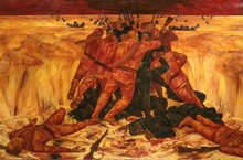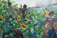 Рубрика "80 дней до Победы" Аркадий Пластов "Подсолнухи" (Немцы идут) 1941 г. В первые месяцы войны Пластов пишет картину «Немцы идут» («Подсолнухи»). «Писал я ее очень волнуясь. Я представлял себе эту трагедию очень ясно, как будто все это совершается перед моими глазами. Было тогда чудесное лето, все было такое свежее, рослое – подсолнухи в сажень высоты. И вот я представил себе, как все это горит, трагически нелепо ломается, цветущая земля засыпается пеплом, ясный воздух застилает гарь. Я сделал много этюдов - все хотелось написать так, чтобы было солнце, свежая зелень, гарь и пожарище и среди всего этого родные люди, смелые и непреклонные». 30.03.2025