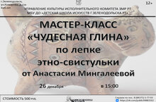 26 декабря в Детской школе искусств состоится мастер-класс лепке этно-свистулек. Это мероприятие порадует как взрослых, так и детей. Участники творческого мероприятия узнают много нового и интересного о таком виде искусства, как лепка, узнают о тонкостях работы с глиной. По окончанию мастер-класса каждый участник создаст свою уникальную этно-свистульку под руководством художника - Анастасии Мингалеевой. Все материалы предоставляются. На мастер-класс необходимо принести с собой бахилы или вторую обувь, а также показать скрин или распечатку билета.