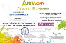 Поздравляем Лауреатов III степени Всероссийского детского конкурса "Детство - счастливая в жизни пора" (2-й сезон) учениц Хуснутдинову Ралину и Матвееву Наталью (класс преподавателя Логиничевой Е.В.)