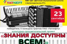 23 сентября 2020 года в Детской музыкальной школе города Зеленодольска в рамках реализации культурно-просветительского проекта "Знания доступны всем" состоятся мастер-классы и концертная программа с участием преподавателей и студентов Козанского музыкального колледжа им. И.В.Аухадеева, Казанской Государственной консерватории им. Н.Г.Жиганова. В концерте примет участие Оркестр преподавателей ДМШ.