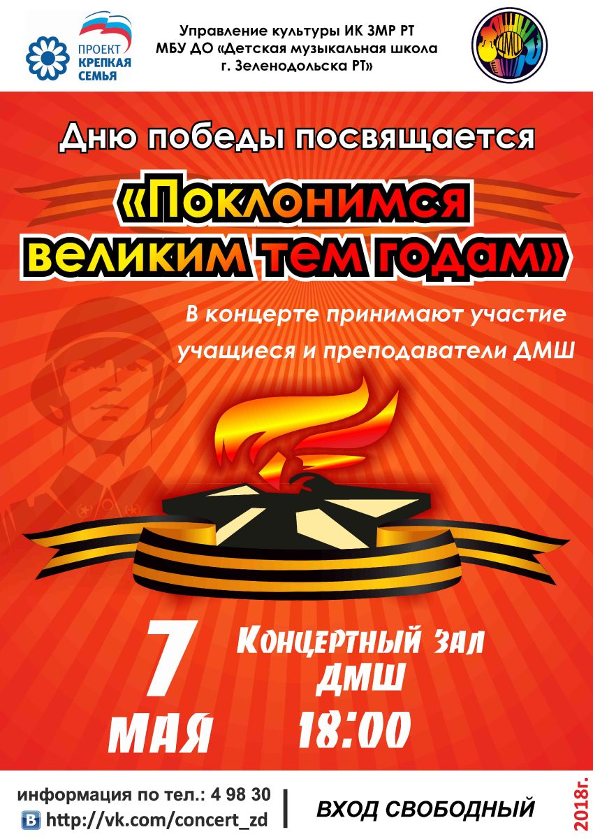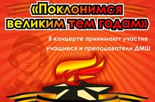 7 мая 2018 года в Концертном зале ДМШ состоится концерт посвященный ДНЮ ПОБЕДЫ "Поклонимся великим тем годам". В концерте принимают участие учащиеся и преподаватели ДМШ. Начало в 18.00. Вход свободный. Информация по телефону: 4-98-30