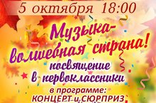 5 октября 2017 года в Концертном зале ДМШ прошел традиционный праздник для первоклассников "МУЗЫКА - ВОЛШЕБНАЯ СТРАНА!". Для юных музыкантов была подготовлена большая концертная программа, в которой были представлены все отделы музыкальной школы, прозвучали загадки и поздравления от руководителей отделов. Все первоклассники произнесли клятву музыканта, получили значок "Юный музыкант" и пригласительный билет на концерт музыкантов творческой школы "Мастер-класс" г.Москва, который состоится 11 октября в 17.00 в Концертном зале ДМШ. По традиции первоклассников ждал сюрприз (выступление фокусника), который понравился не только маленьким зрителям, но и их родителям. Музыкальный вечер совпал с Всемирным «Днем учителя». Ведущая концерта Залялиева Лиля Рашидовна поздравила всех преподавателей с профессиональным праздником. Праздник «Посвящение в первоклассники» прошел интересно, увлекательно, в зале не смолкали аплодисменты!