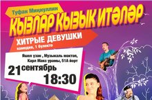 21 сентября в Детской музыкальной школе города Зеленодольска состоится спектакль «Кызлар кызык итэлэр» («Хитрые девушки»). Это известная музыкальная комедия по пьесе Туфана Миннуллина «Ак тэyбэ, кара тэубэ». В основе сюжета- молодость, любовь, песни. Смейся, играй, пой! Ведь молодость приходит к человеку на очень короткое время, дорожи ей. Именно этим спектаклем открыл свой первый сезон Нижнекамский татарский государственный драматический театр, который сейчас носит имя Т.Миннуллина. Премьера спектакля состоялась 16 марта 1990 года. Премьера восстановленного спектакля состоялась 29 ноября 2015 года. Режиссер - Народный артист Республики Татарстан, Заслуженный деятель искусств Республики Татарстан Р.Галиев. Спектакль состоится 21 сентября в 18.30 в Концертном зале Детской музыкальной школы по адресу К.Маркса 51А. Стоимость билета 350 рублей. Спектакль идет на татарском языке.