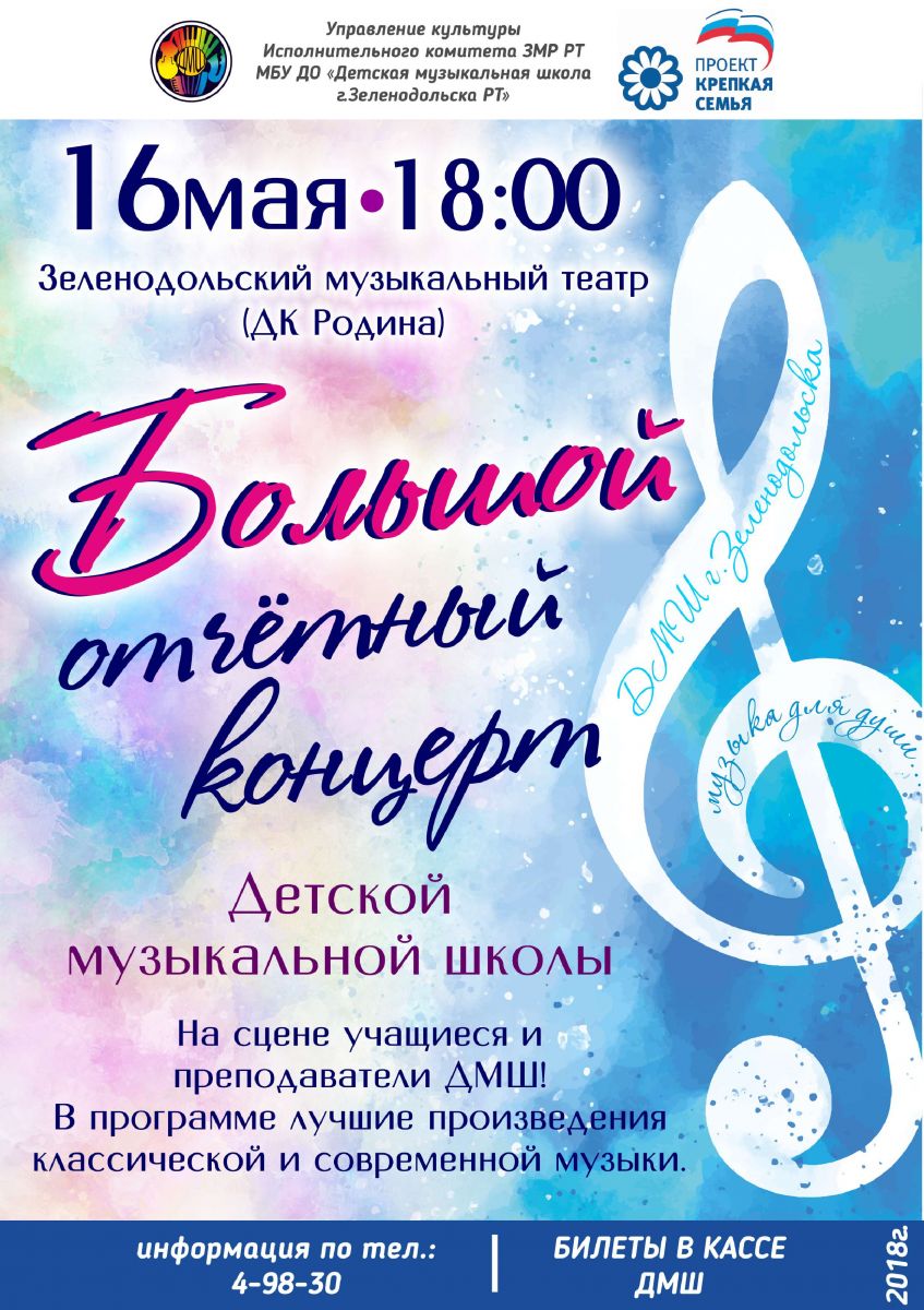 Опубликовано: 25.04.201816 мая 2018 года в Зеленодольском музыкальном театре (ДК Родина) состоится БОЛЬШОЙ ОТЧЁТНЫЙ КОНЦЕРТ ДЕТСКОЙ МУЗЫКАЛЬНОЙ ШКОЛЫ. На сцене учащиеся и преподаватели ДМШ! В программе лучшие произведения классической и современной музыки. Начало в 18.00. Информация по телефону: 4-98-30. Билеты в кассе ДМШ.