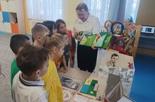 Сегодня провели тематическое занятия для детей подготовительной к школе группы, посвящённые 120-летию со дня рождения Мусы Джалиля. Дети познакомились с героическим подвигом поэта, рассмотрели картины и иллюстрации из его книг, послушали и рассказали его стихи «Кызыл ромашкалар», «Карак песи».