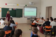 Ко дню 60-летия первого полета человека в космос 12 апреля с 4ж классом прошел классный час "Путешествие в космос". Дети познакомились с профессией "космонавт", запомнили интересные факты из истории покорения Вселенной, узнали, что скафандр космонавта весит 50 килограммов. Внимательно слушали рассказ библиотекой об "отце космонавтики" К.Э. Циолковском, о созданной С.П. Королевым многоступенчатой ракете.
