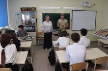 Боец сначала коротко рассказал о себе, а затем поведал ребятам о военных буднях, о бытовых условиях проживания на передовой, о трудностях и риске, с которыми участники СВО сталкиваются ежеминутно.