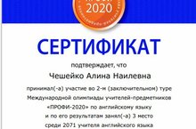 По результатам олимпиады Алина Наилевна вошла в тройку победителей, заняв почетное 3 место среди 2071 учителей английского языка. Поздравляем!