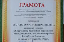 Бүген 2024 елның 20 сентябрендә Татарстан Республикасы Зеленодольск муниципаль районы мәгариф хезмәткәрләре Спартакиадасында җиңүчеләрне бүләкләү тантанасы узды. Балалар бакчасы тәрбиячесе Иванова Оксана Вениаминовнаны җиңүе (2нче урын) белән котлыйбыз., камиллеккә һәм үз-үзеңне үстерүгә омтылырга, тагын бик күп җиңүләр һәм якыннарыңа ярдәм итәргә!.