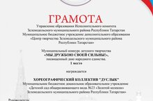 Поздравляем наших юных талантов, хореографический коллектив "Дуслык" (подготовительная группа №5, воспитатель Ахметзянова Айгуль Рашитовна) с Победой - 1 место в муниципальном конкурсе детского творчества "Мы дружбою своей сильны!". Благодарим нашего музыкального работника - Ведешкину Маргариту Андреевну, за большой вклад в постановке танца и организации детей. Молодцы!