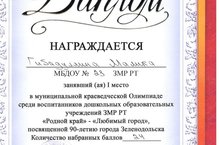 Воспитанница подготовительной группы №5 Гибадуллина Малика участвовала в муниципальной краеведческой Олимпиаде среди воспитанников дошкольных образовательных учреждений ЗМР РТ "Родной край" - "Любимый город", посвященная 90-летию города Зеленодольска. Набрав 24 балла, получила I место!!! Молодец!!! 5нче мәктәпкә әзерлек төркемендә тәрбияләнүче Гибадуллина Мәликә Яшел Үзән шәһәренең 90 еллыгына багышланган "Туган җир" - "Яраткан шәһәрем" дип исемләнгән мәктәпкәчә белем бирү учреждениеләре арасында узган Олимпиадада катнашты. 24 балл белән 1 нче урынны яулады!!! Афәрин!!!