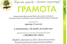 Безнең балалар бакчасы "ЭКОЯЗ - 2022" республика акциясенең муниципаль этабында 3 нче урынны яулады. Котлыйбыз!