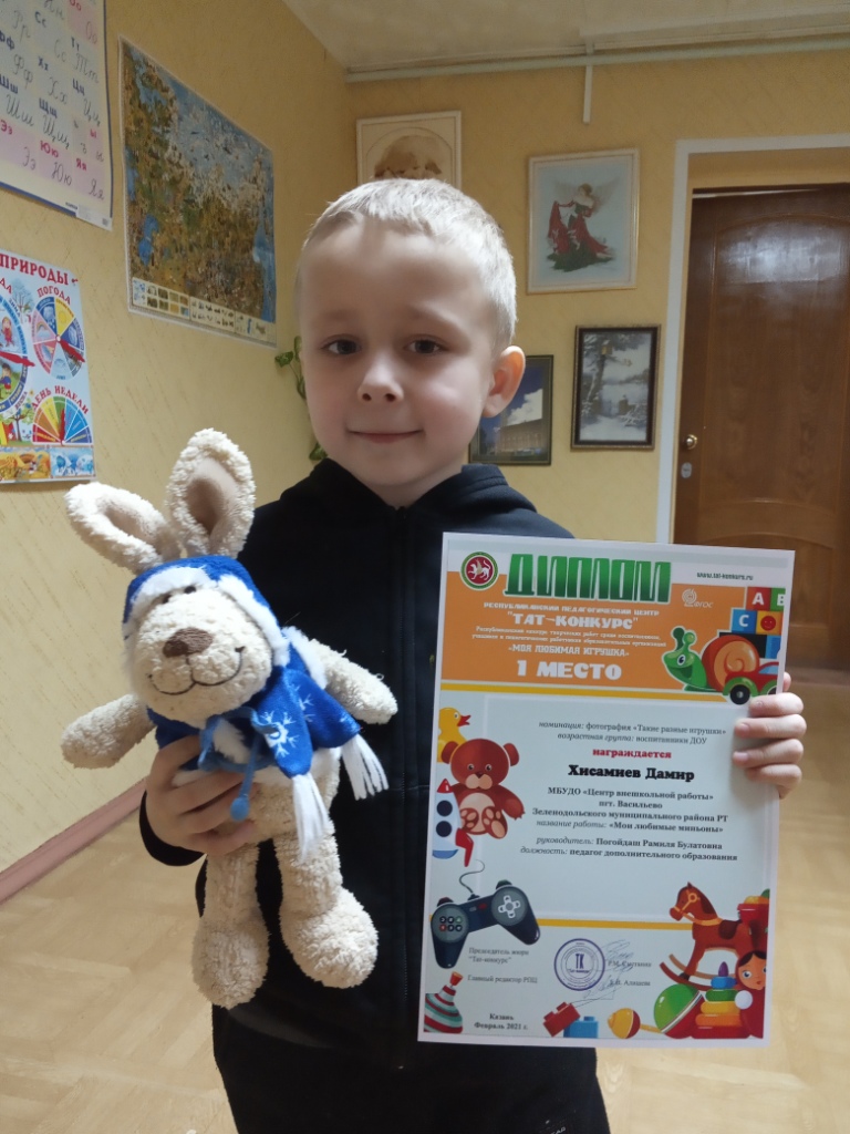 В феврале 2021 года учащиеся объединения «Скоро в школу» приняли участие в республиканском конкурсе «Моя любимая игрушка» и заняли призовые места: Хисамиев Дамир - 1 место, Павлова Изабелла - 2 место, Гаптулхаев Рамиль - 3 место! Поздравляем!!!