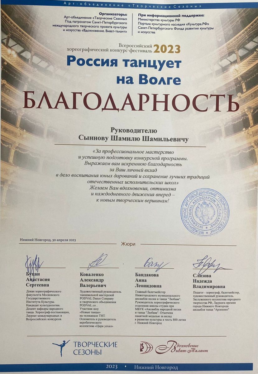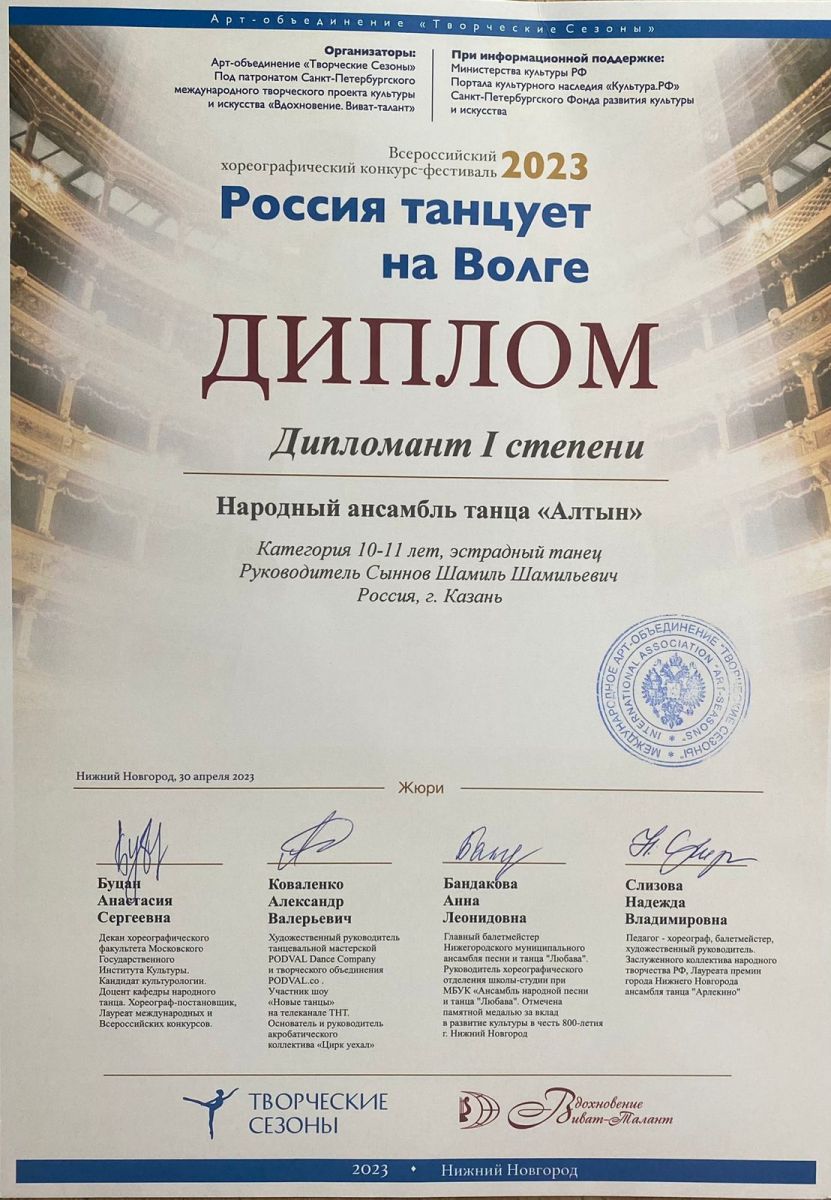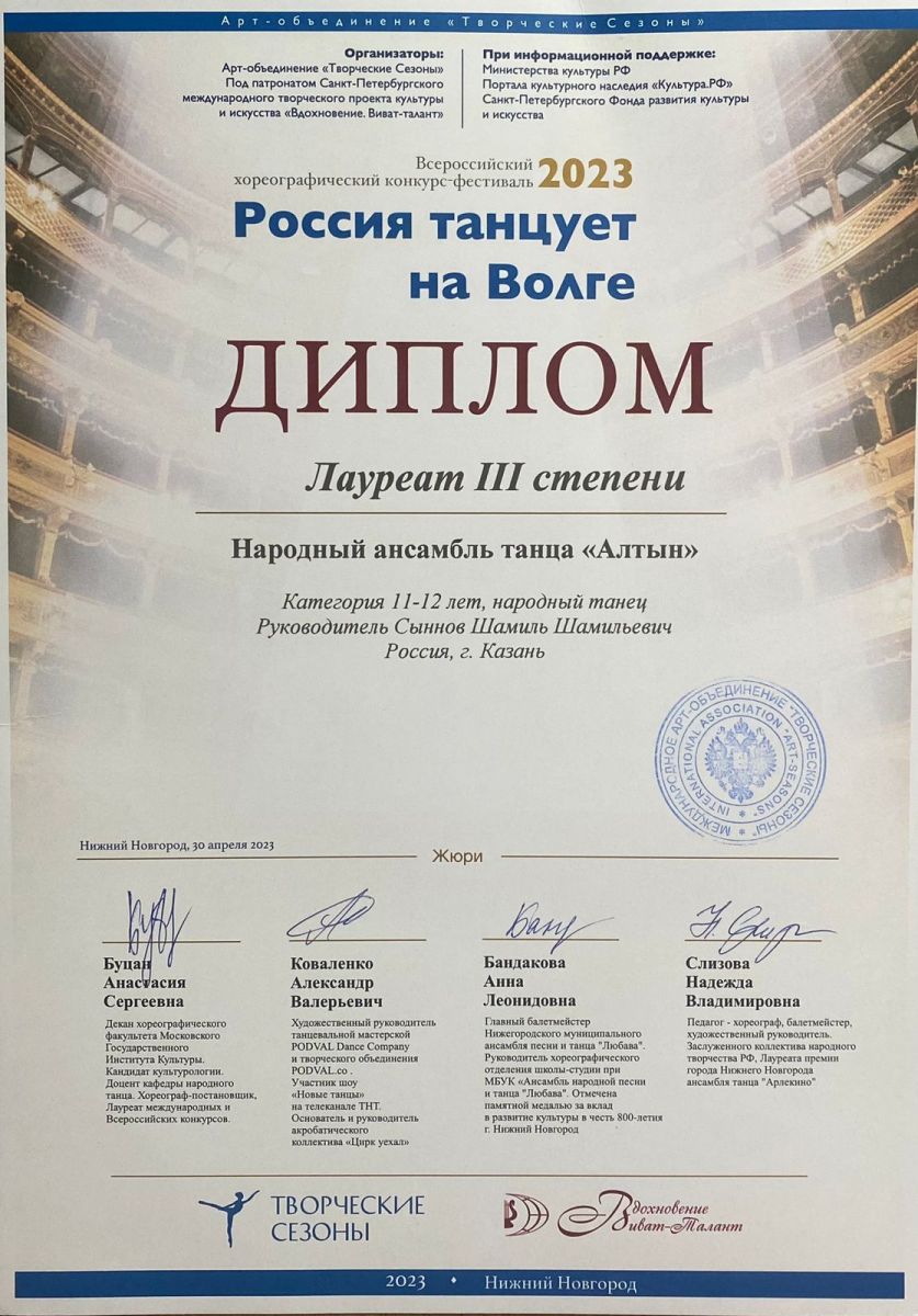 С 28 апреля по 2 мая 2023 года учащиеся объединения «Алтын» приняли участие во Всероссийском хореографическом конкурсе-фестивале «Россия танцует на Волге», который прошел в городе Нижний Новгород при поддержке Министерства культуры РФ. Объединение «Алтын» представило на суд жюри 4 хореографические композиции и стали Дипломантами 1 степени в номинации «Эстрадный танец» и Лауреатами 3 степени в номинации «Народный танец» в упорной творческой борьбе с коллективами из городов РФ Нижний Тагил, Москва, Киров, Коммунар, Екатеринбург, Усинск, Уфа, Самара, Архангельск и многих других! Поздравляем с победой на столь высоком уровне! /upload/storage/org986/files/20230502 Алтын 1.jpg /upload/storage/org986/files/20230502 Алтын 2.jpg /upload/storage/org986/files/20230502 Алтын 3.jpg /upload/storage/org986/files/20230502 Алтын 4.jpg