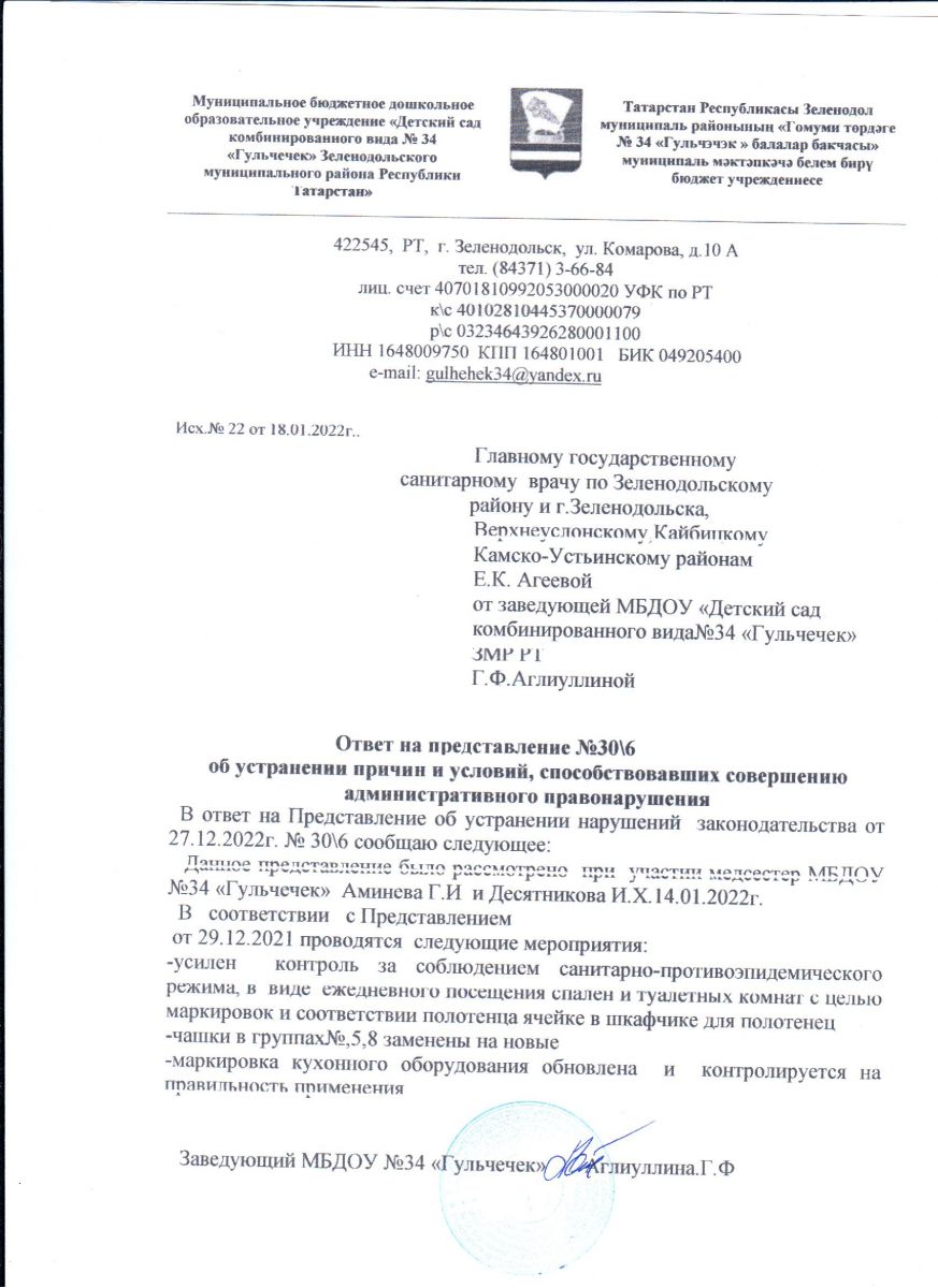 Ответ на представление № 30/6 об устранении административного правонарушения