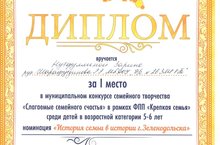 Подведены итоги муниципального конкурса семейного творчества "Слагаемые семейного счастья" в рамках проекта "Крепкая семья". Наш детский сад представила воспитанница подготовительной группы №7 Зарина Л. Она заняла 1 место. Поздравляем победительницу!