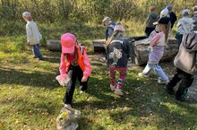 Подготовительная к школе группа «Звездочки» в солнечный денек отправилась в экологический поход. По дороге в лес ребята закрепили правила дорожного движения, дорожные знаки и понятие «перекресток». А в лесу ребята не только любовались красотой осеннего леса и дикими уточками , но и провели акцию «Чистый берег». Дети собрали мусор на берегу лесного озера и на лесной полянке у родника. На «привале» сделали небольшой перекус , и в отличном настроении вернулись в детский сад
