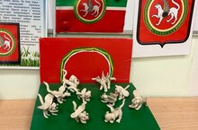 и внимательно рассмотрели герб Республики Татарстан. Ребята в группе "Карамельки" обнаружили, что на картине с гербом республики отсутствует снежный барс и решили немедленно исправить непорядок. «Карамельки» снарядились пластилином и принялись за лепку барса.