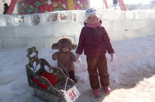 Мишку в санки посадила,