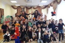 Сегодня в детском саду в старшей и подготовительной группах воспитатели провели карнавальный Хэллоуин. Для декорации зала были использованы воздушные шары, пауки, летучие мыши, тыквы. Воспитанники узнали историю возникновения праздника, активно участвовали в различных конкурсах.