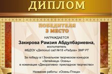 Подведены итоги I Зонального творческого конкурса «Затейница- Осень», организаторами которого являются ЧОУ ДО «Центр детского творчества и образовательных услуг» (г. Чистополь). В конкурсе приняли участие 642 участника из городов и населенных пунктов Республики Татарстан. В номинации "Декаративно-прикладное творчество" воспитатель Закирова Р.А. заняла 3 место. Поздравляем! Желаем дальнейших побед!!!
