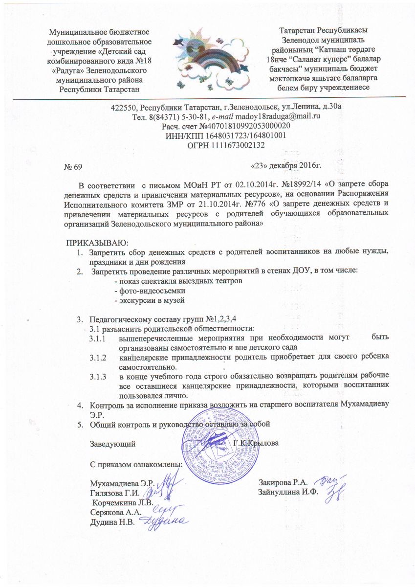 Распоряжение ИК ЗМР О недопущении незаконных сборов денежных средств с родителей обучающихся