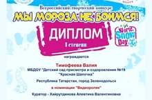 Воспитатель Хайрутдинова А.В. и воспитанница Стюфеева Валия приняли участие во Всероссийском творческом конкурсе" Мы мороза не боимся!" в номинации "Видеоролик" и получили диплом 1степени. Поздравляем!!!