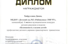 Наши воспитанники приняли активное участие в муниципальном конкурсе детских рисунков и поделок "Безопасность глазами детей" по профилактике дорожно-транспортного травматизма. Поздравляем воспитанницу Хайруллину Диану, занявшую 1 место! Почетные 3 места заняли воспитатели Риза Н.В., Фаракшина Л.З. и Чекмарева С.О. Поздравляем и желаем творческих успехов!