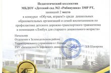 Педагогический коллектив детского сада в конкурсе "Обучая, играем!" среди дошкольных организаций и семей воспитанников по профилактике детского дорожно-транспортного травматизма занял 2 место в номинации "Лепбук для старшего дошкольного возраста"