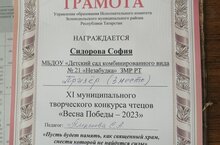 Поздравляем Сидорову Софию, воспитанницу подготовительной группы ,занявшую 3 место в муниципальном творческом конкурсе чтецов
