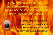 ГЛАВНОЕ УПРАВЛЕНИЕ МЧС РОССИИ ПО РЕСПУБЛИКЕ ТАТАРСТАНУПРАВЛЕНИЕ НАДЗОРНОЙ ДЕЯТЕЛЬНОСТИ И ПРОФИЛАКТИЧЕСКОЙ РАБОТЫЭКСПРЕСС-ИНФОРМАЦИЯБЕЗОПАСНОСТЬ ДЕТЕЙВ 2018 году в огне пожаров погибло 5 детей, травмы различной степени тяжести получили 26 детей.Нарушение правил устройства и эксплуатации электрооборудования явилось причиной гибели 3 детей, неосторожность при курении взрослых - 2 детей.Детская шалость с огнем послужила причиной травмирования 7 детей, нарушение правил устройства и эксплуатации электрооборудования - 3 детей, неосторожное обращение с огнем - 11 детей, разряд статического электричества - 1 ребенка, нарушение правил устройства и эксплуатации газового оборудования - 2 детей, нарушение правил эксплуатации бытовых бензиновых устройств - 1 ребенка, нарушение правил пожарной безопасности при использовании пиротехнических изделий - 1 ребенка.16.12.2018 года в 04.09 произошел пожар в одной из квартир по ул.Мира г.Казани. В результате пожара погиб годовалый мальчик, его брат 4 лет и сестра 10 лет получили травмы различной степени тяжести и не погибли благодаря действиям очевидцев пожара. На момент возникновения пожара все трое взрослых находились в нетрезвом состоянии. Причиной пожара явилась неосторожность при курении.Уважаемые родители!Поговорите со своим ребенком о правилах пожарной безопасности:1. Не оставляйте детей одних дома без присмотра.2. Важно, чтобы ребенок осознал, что спички - это не игрушка, а огонь - не забава, чтобы у него сложилось впечатление о пожаре как о тяжелом бедствии.3. Необходимо учить детей правилам безопасного пользования бытовыми электроприборами и газовой плитой.4. Расскажите об опасности легковоспламеняющихся жидкостей.5. Научите ребенка правилам поведения в случае возникновения пожаров. Дети должны знать свой адрес и телефон пожарной охраны. Объясните детям, что при пожаре не нужно прятаться, стараться что-то вынести из дома или спасти какие-то вещи. Дети должны сконцентрироваться только на одной задаче - выйти невредимыми из дома.6. Чрезвычайно опасно, если дети остаются в запертых квартирах или комнатах. В случае пожара они не смогут выйти из охваченного огнем помещения наружу.7. Не оставляйте спички и зажигалки в доступном для ребенка месте.8. Не оставляйте ребенка одного присматривать за топкой печи.9. Не разрешайте ребенку самостоятельно запускать фейерверки.10. Расскажите ребенку об опасности разведения костров.Единый телефон доверия Главного управления МЧС России по Республике Татарстан: +7 (843) 288-46-96Единый номер вызова экстренных служб с сотового телефона – 112http://www.16.mchs.gov.ru - официальный Интернет сайт ГУ МЧС РФ по РТ -
