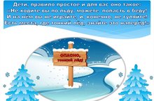С наступлением морозной погоды не стоит рассчитывать на мгновенное покрытие водоемов льдом. Это процесс длительный и зависит от многих факторов. Практически каждый год случаются ситуации, когда наиболее нетерпеливые любители зимней рыбалки или катания на коньках попадают в опасное положение, оказываясь в ледяной воде. И все потому, что не берется во внимание толщина льда. Таким любителям первым делом надо изучить меры безопасности на льду в зимний период, а только потом отправляться на водоем. Именно с целью профилактики несчастных случаев на льду, в осеннее – зимне - весенний период, проводятся в нашем ДОУ мероприятия, с воспитанниками и родителями.
