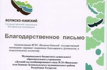 В декабре 2018 года наш Детский сад принял активное участие в первом этапе "Творческое волонтерство на благо заповедника" Республиканского конкурса детского рисунка и творческих работ "Заповедная природа Республики Татарстан". Диплом за I место вручили Юлаеву Тимуру воспитаннику подготовительной группы в номинации "Календарь природы" педагог Жаркова Анастасия Михайловна. Так же дипломами участника конкурса были награждены Журавлева Регина, педагог Номоконова Олеся Владимировна и Урманова Самира, педагог Егорова Гулия Ильгизовна.Детскому саду вручили благодарственное письмо за активное участие. Будем и дальше активно участвовать и плодотворно сотрудничать с Волжско- Камским государственным природным биосферным заповедником! Желаем нашим педагогам успехов!