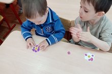 Малыши с удовольствием и особым интересом лепили. Делили кусок пластилина на части, скатывали шарики кругообразными движениями между пальчиками, прикрепляли шарик к основе, заполняя ими заданное