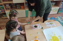 Сегодня во второй младшей группе №9 была проведена коллективная работа по художественно - эстетическому развитию. Дети совместно с педагогом использовали нетрадиционную технику рисования ладошками на тему: «Весна- красна»Солнце выше все и жарче,