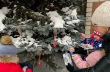 Ребята средней группы 5 изготовили своими руками необычные ёлочные игрушки изо льда и нарядили ёлку у входа в детский сад.