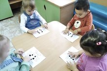 Наши самые младшие воспитанники развивают мелкую моторику рук на занятиях по лепке, старательно прикрепляя шарики из пластилина к крылышкам божьей коровки.