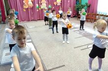 Ребята средней группы "Непоседы" на физкультурном занятии упражняются в ходьбе и беге, выполняют общеразвивающие упражнения с мячом и играют в подвижные игры.