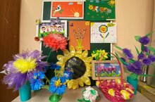 На XII Фестиваль по экологии детьми, родителями и воспитателем старшей группы была представлена работа : Выставка "Панно из фантиков и цветы из пакетов"