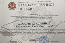 Минестерство образования и науки Республики Татарстан, выражает слова благодарности педагогу А.Ф.Сунгатуллиной за организацию выставки в рамках проведения Республиканского форума педагогических работников и управления кадров "Развития национального образования в рамках августовского совещания работников образования и науки Республики Татарстан".