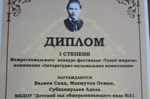 Валиева Саида, Махмутова Османа, Субханкуллова Аделя Поздравляем с Дипломом I степени межрегионального конкурса фестиваля «Тукай мирасы» номинация «Музыкально-литературная композиция». Желаем дальнейших Побед!