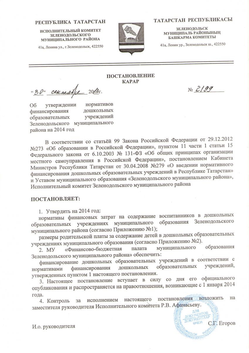 Постановление Исполкома от 30.09.2013 года №2199 "Об утверждении нормативов финансирования ДОУ ЗМР на 2014 год"