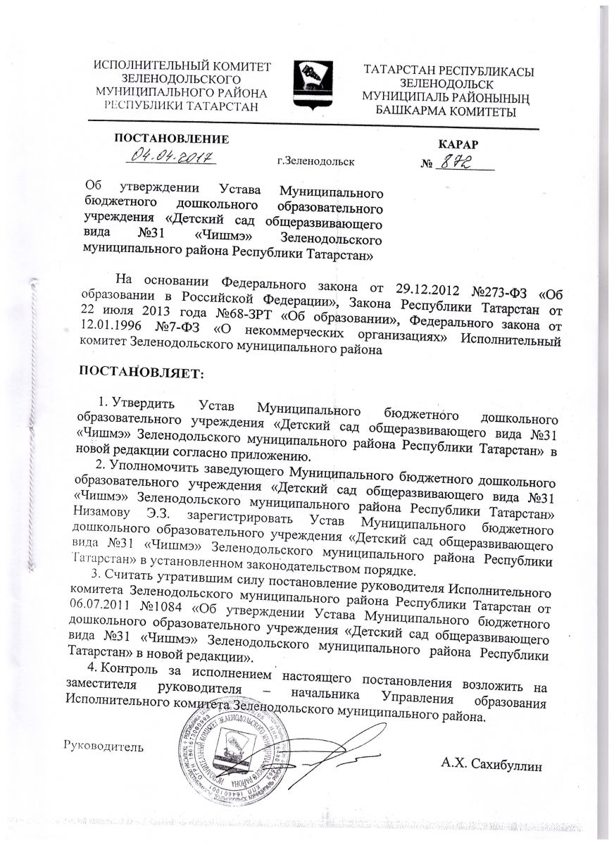 Постановление № 872 от 04.04.2017г. "Об утверждении Устава Муниципального бюджетного дошкольного образовательного учреждения "Детский сад общеразвивающего вида № 31 "Чишмэ" Зеленодольского муниципального района Республики Татарстан"