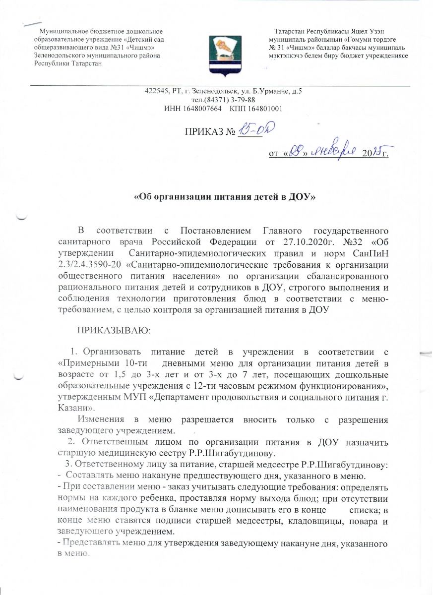 Приказ №16-ОД "О назначении ответственного лица за снятие и хранение суточных проб в ДОУ"
