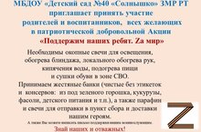 Гыйнвар-февраль айларында "Za МИР" акциясе старт алды, анда теләге булган һәркем катнаша ала. Сугышчыларга зур теләк һәм җаваплылык белән хат язалар тәрбияләнүчеләр әти-әниләре белән. Егетләребезгә алгы сызыкта ярдәм итик!