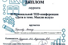 Балалар бакчасында тәрбияләнүче Данис Г. "һәйкәлләр һәм скульптуралар тарихында Татарстан Республикасының мәдәни байлыгы" проекты белән II региональ TED-конференциядә лауреат булды. Конференция Түбән Кама шәһәрендә көндезге форматта узды.