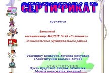 Воспитанники МБДОУ №40 "Солнышко"- Данилова В., Тихонов К., Марченко А., Бурунина А. приняли участие в Республиканском конкурсе рисунков "Конституция глазами детей" от организатора конкурса - Конституционный суд Республики Татарстан. Спасибо ребятам и родителям за интересные творческие работы, которые отмечены Сертификатом!
