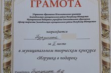 Татарстан Республикасы Яшьләр эшләре, спорт һәм туризм министрлыгының "Солнышко" 40 нчы номерлы балалар бакчасында тәрбияләнүчеләр "Татарстанның 100 еллыгы-100 бизәк" дигән эшләр конкурсында "Әби бакчасында" - Ветлугина Виктория, "Сирень ботагы" - Бурунина Анна икенче урынны яуладылар. Номинация- "Тасмалар белән чигү". Котлыйбыз!!!